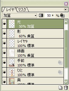 さらに上に、1枚レイヤーを加えます。 ブレンドモードは「加算」、不透明度を50%くらいにします。