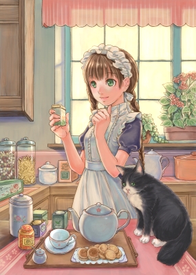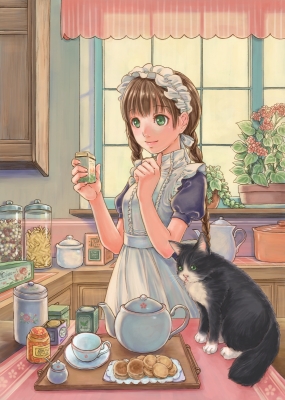 光を強調したいところに、黄色に近いオレンジ色で、軽く色を置いていきます。 窓や、髪の毛、入れ物など。